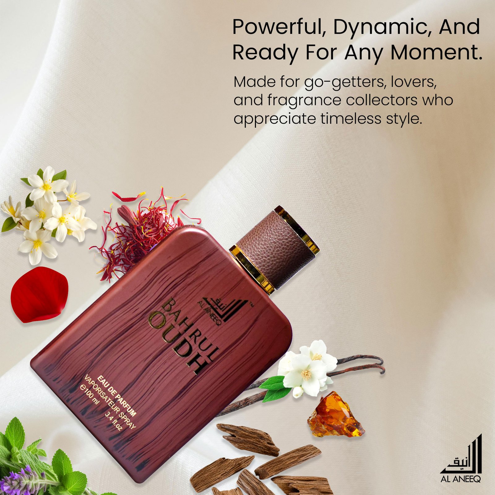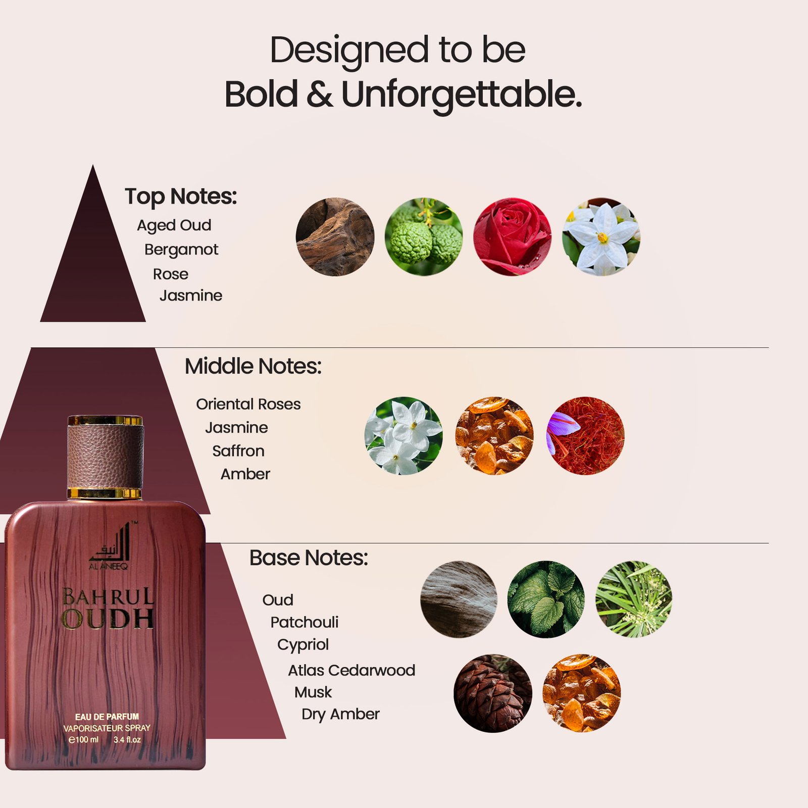 Top Notes: Aged oud, Citrus note (bergamot), Floral (rose, jasmine)
