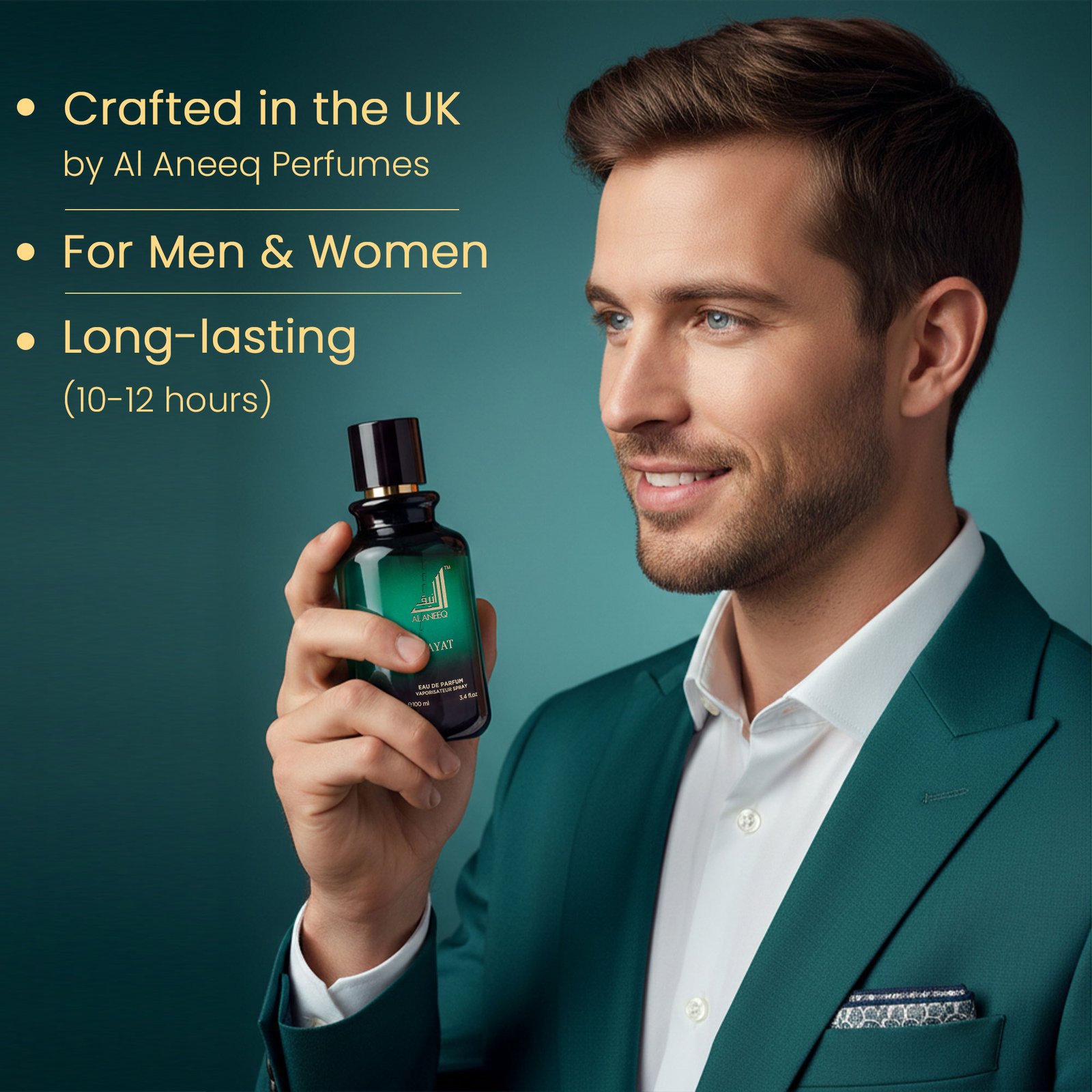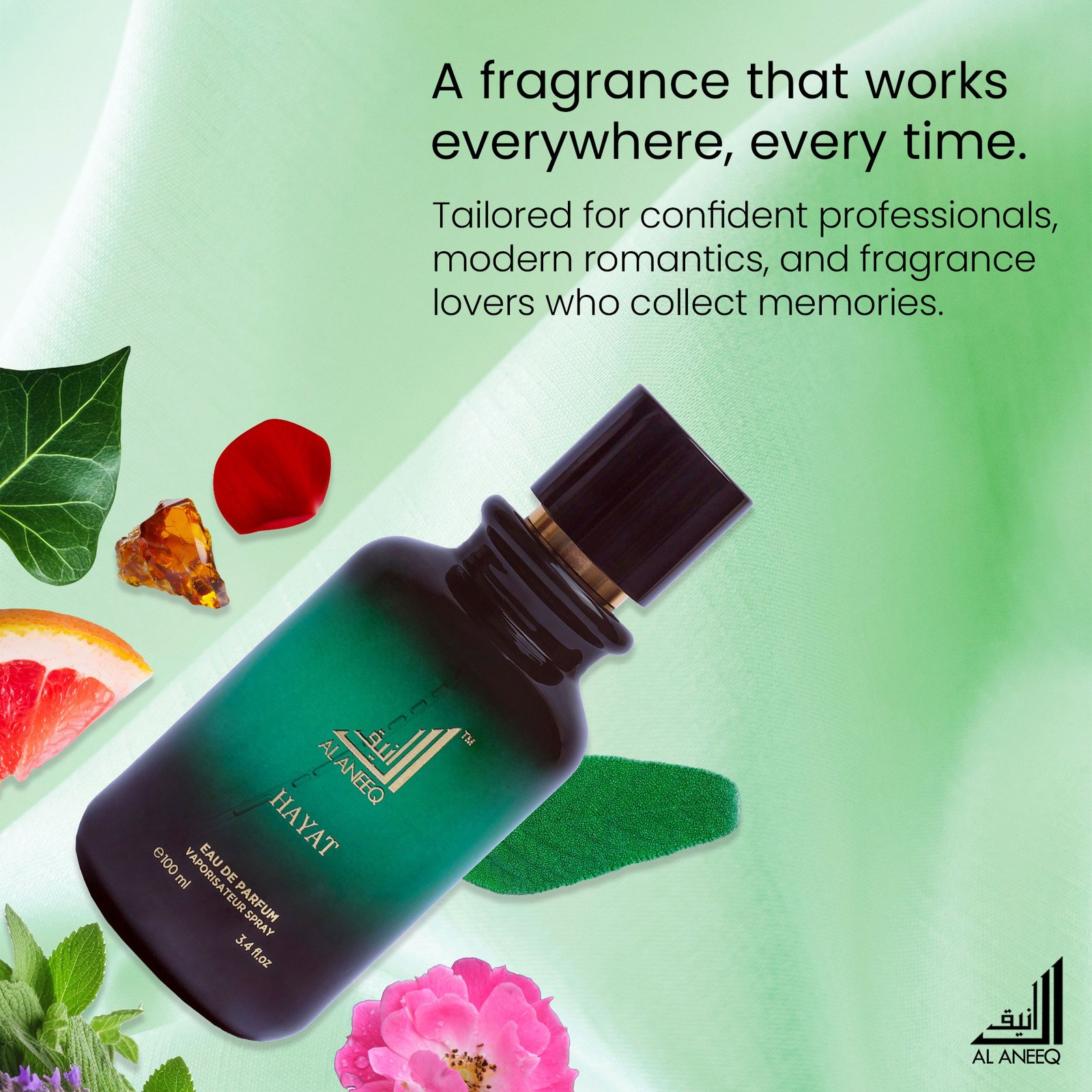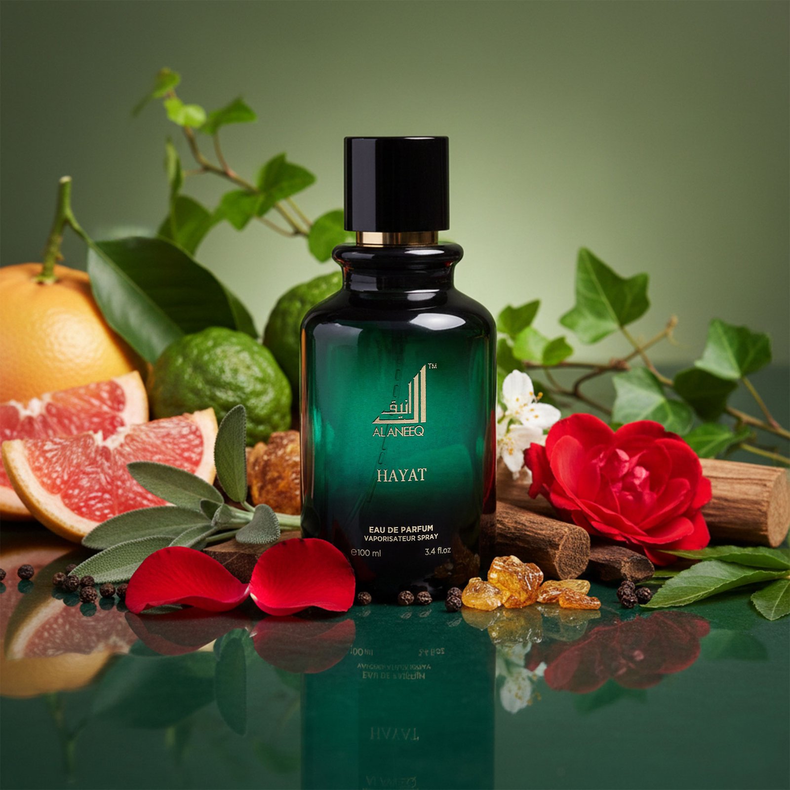 Hayat starts off very fresh, green and bursting notes paired with a grapefruit accord and essence of spice in the form of black pepper creating a sensation of natural vitality. Then come the heart notes of Damascene rose from Bulgaria perfectly blended to suit both men and women, and a very woody accord which brings the fragrance to new heights, gradually enhanced by the woody amber base notes which infuse the sillage with sensuality & sophistication for the modern man and woman.